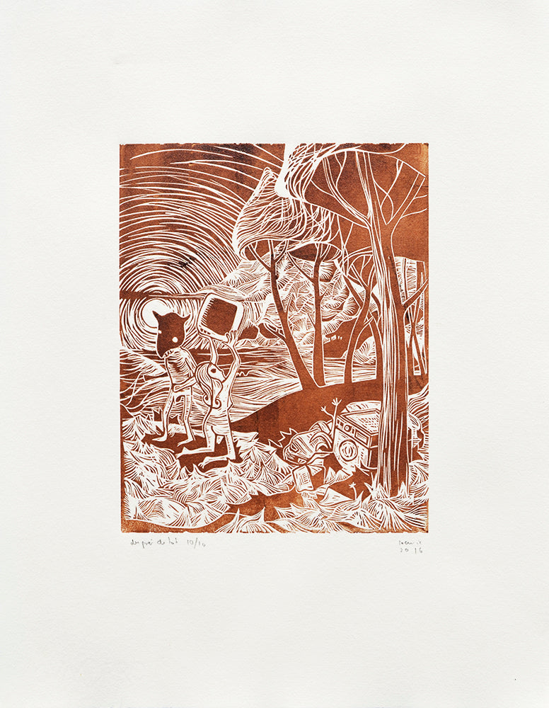 Sèrie de gravats fets sobre planxa de linòleum de 20x30cm aprox. Gravat i brunyit manualment. Tinta calcogràfica sanguina charbonnel.